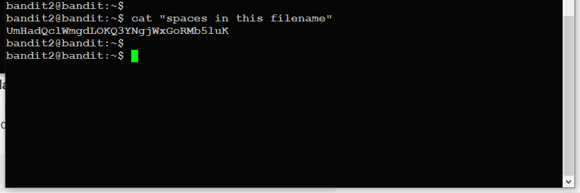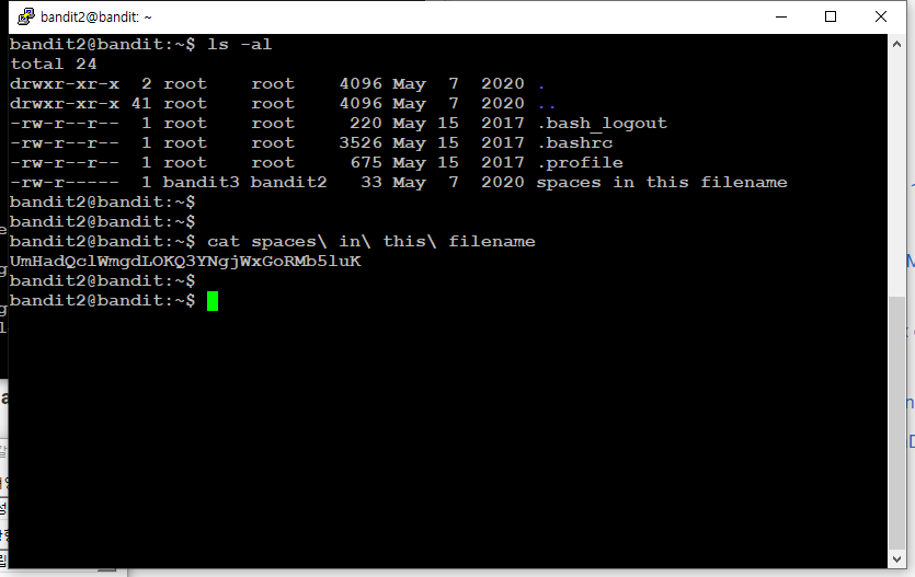 bandit2 서버에서는 직접 타이핑하지 말고 파일명 앞에서 tab 으로 자동완성시켜주면 자동으로 \이 삽입됩니다.