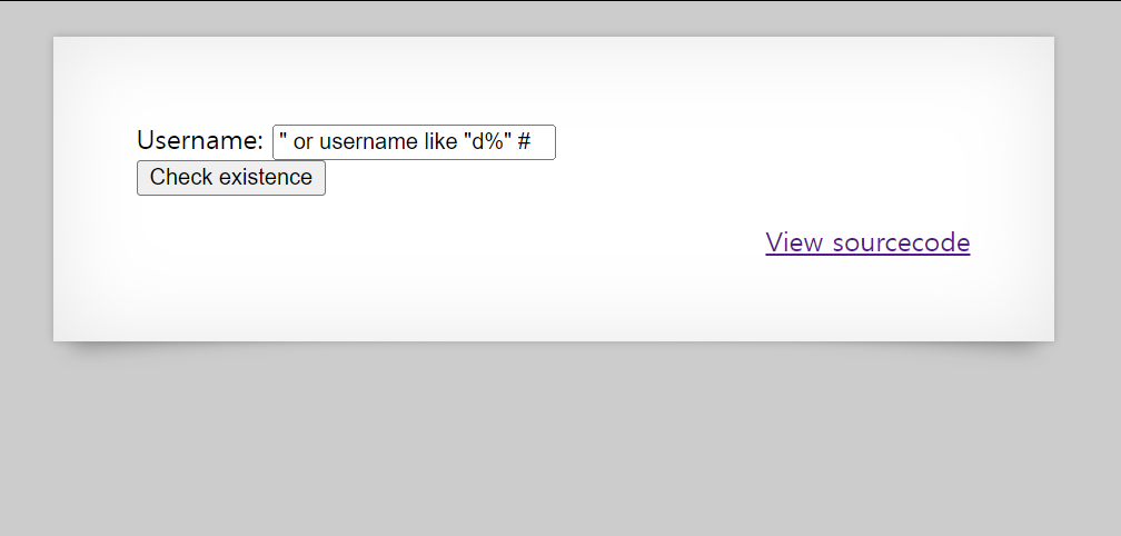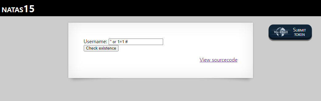 natas14 와 마찬가지로 " or 1=1# 구문으로 sql injection 을 하면 되는거 아닌가? 싶지만
