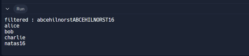 Data = {'username' : 'natas16" and password LIKE BINARY "%' + char + '%" #'}